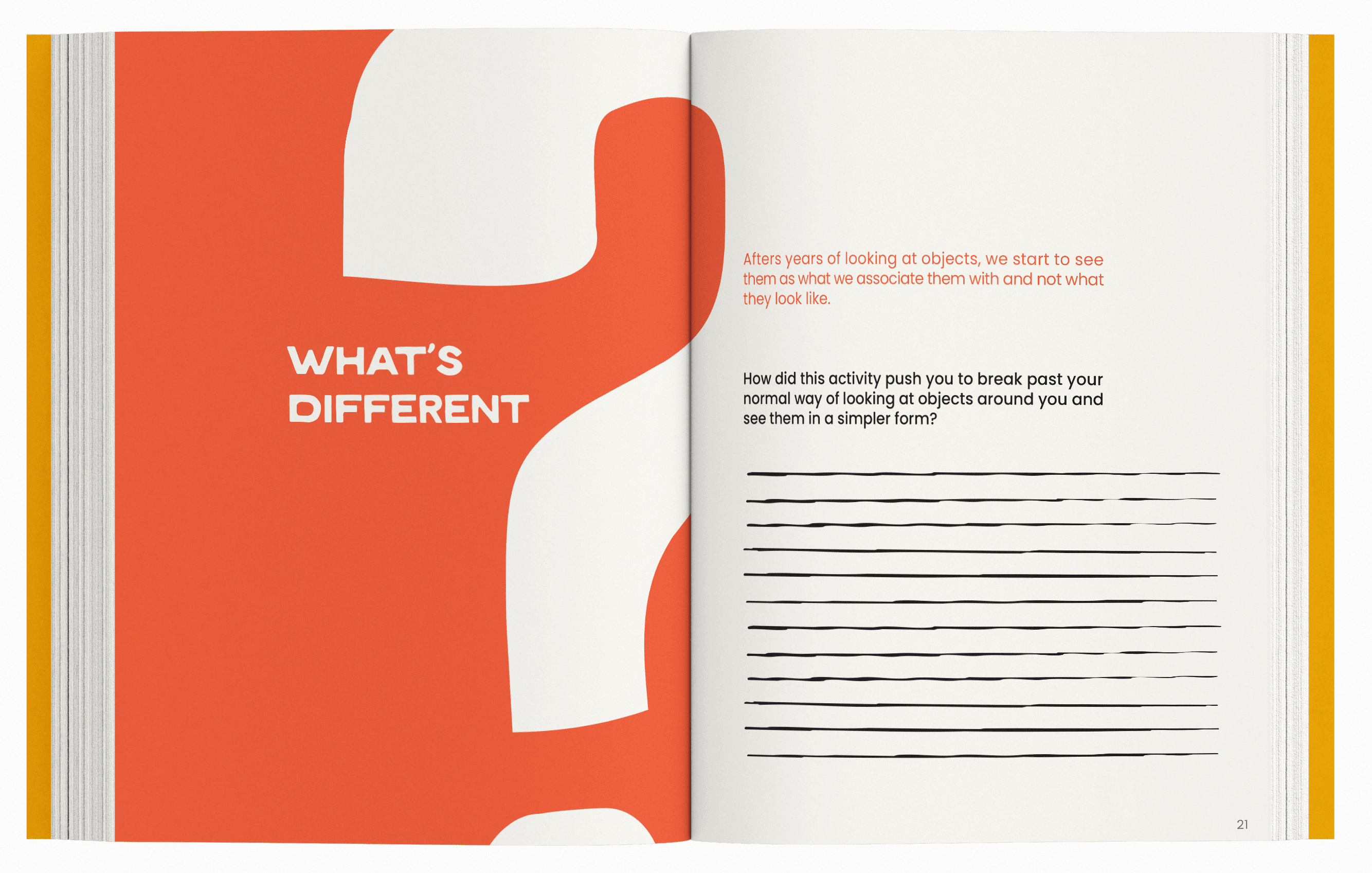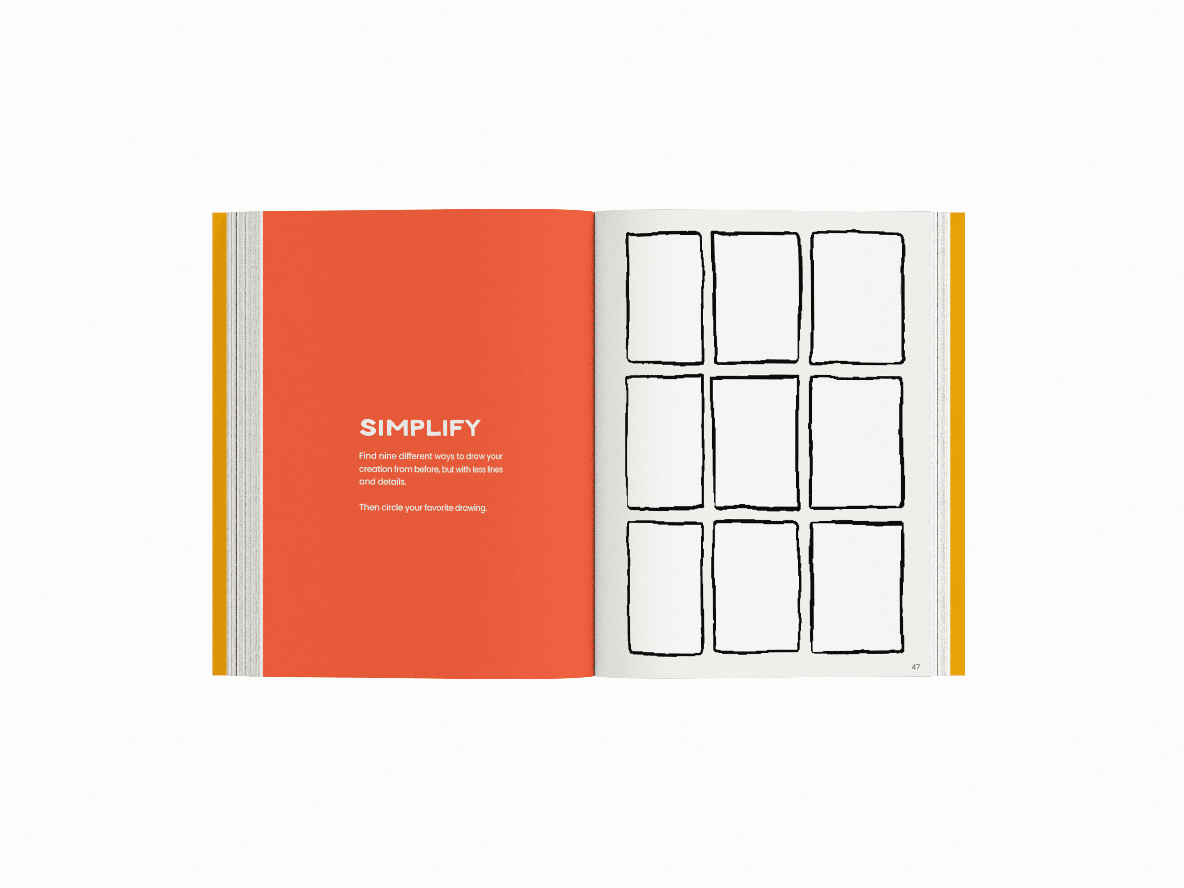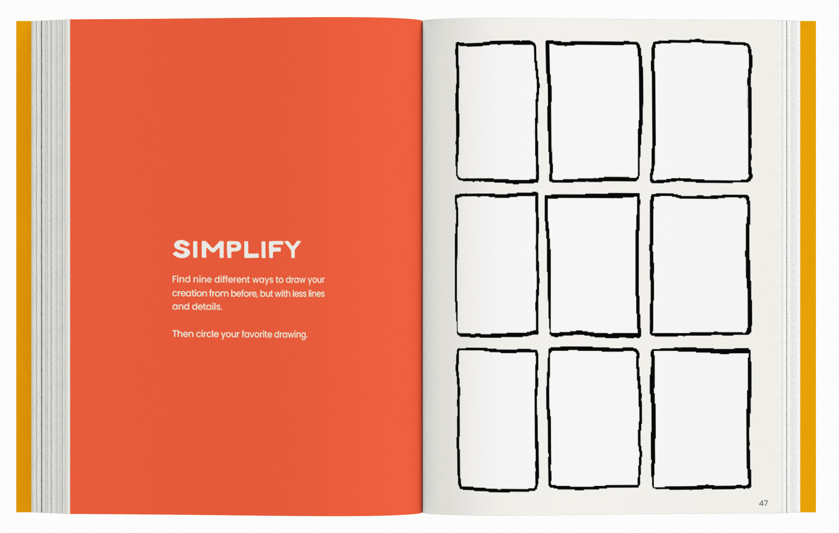 Each activity book is divided into sections using pages like these, featuring our signature Mid-Century Modern yellow. These pages include quotes from the featured artist that relate directly to the activities in that section